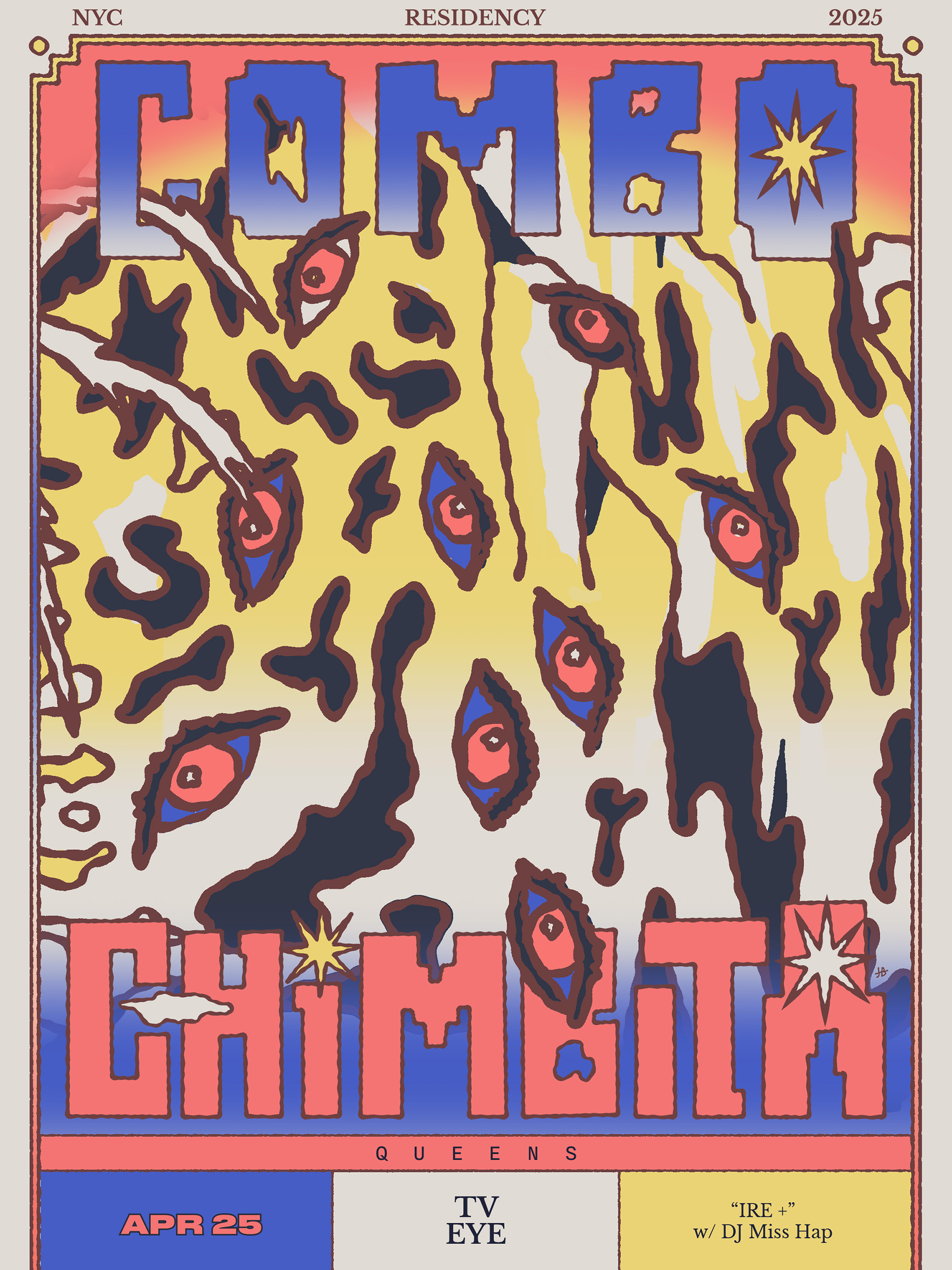 Poster for a 4-show residency Combo Chimbita played in NYC. The band needed an image that could slightly change for each one of the shows. The proposal was to create an illustration composed of 4 different “scenes”, where each one of the scenes becomes a poster on its own.