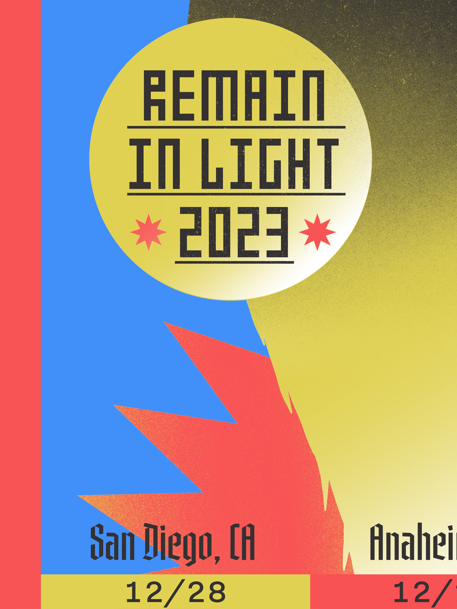 Poster commissioned for a string shows part of the “Remain In Light” tour, where original Talking Heads member Jerry Harrison and long–time collaborator Adrian Belew have been playing the iconic band's record.4-color screen-printed on Cougar White 100lb paper by Native Screen Print Co.